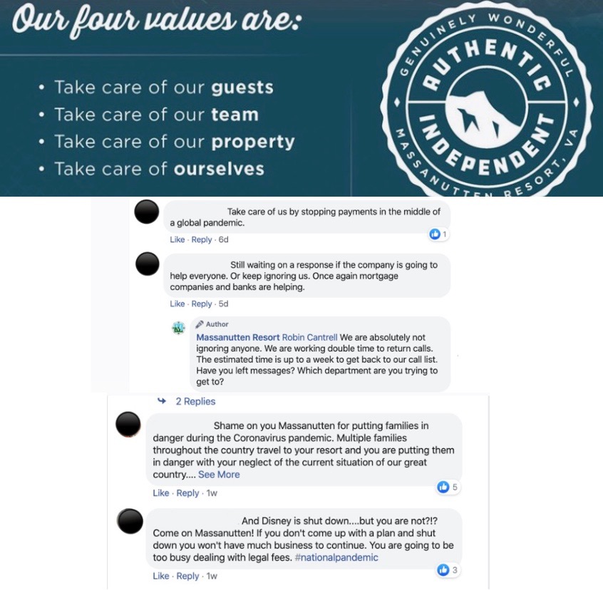 As a well-respected resort, it is in Massanutten’s best interest to protect what they value most: their guests, team and property. Below are comments left by customers who are frustrated by Massanutten’s decision to keep its outdoor facilities open to the public. This is a tough time for everyone and it is important that the resort considers and addresses people’s opinions and fears fairly to create a positive atmosphere and reputation amidst the COVID-19 pandemic.