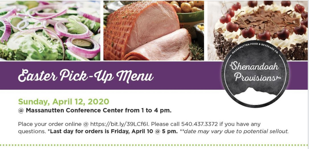 As churches have closed their physical location across the nation, families will have to celebrate Easter from their home with their families. Massanutten Resort will be offering take-out Easter meals as a service to families who do not want to cook or do not have the resources, such as ingredients or kitchen, to do so.